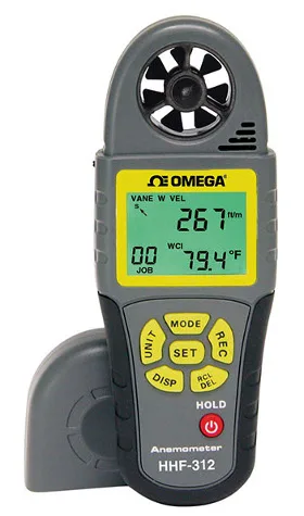 El anemómetro HHF-312 calcula el índice de sensación térmica y temperaturas de punto de rocío / bulbo húmedo y muestra los resultados en un LCD backlit con lectura dual y brújula. También puede almacenar hasta veinte lecturas.