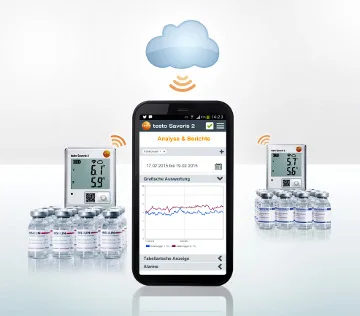 Los valores de medición quedan almacenados allí de forma segura y pueden consultarse de forma flexible en cualquier momento y desde cualquier parte del mundo con un ordenador, un Smartphone o una Tablet. Esto libera a los responsables de la presión de tener que estar siempre en el lugar de medición para tener sus productos bajo control. Si se exceden los valores de medición, se envía un mensaje de alarma por SMS o por correo electrónico.