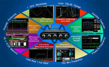 Estas ocho funcionalidades consisten en un analizador de respuesta de frecuencia de rango dinámico de 100 dB, un osciloscopio de 1 GHz, un analizador de espectro, un generador de formas aleatorias, un data logger, un medidor de frecuencia y fase, un analizador lógico, y un generador de patrones.