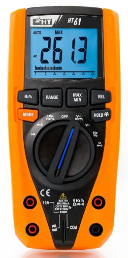 El HT61 TRMS con pantalla LCD retroiluminada de 4 ½ dígitos también se caracteriza por funciones de auto-rango y auto-apagado (tras 15 minutos sin usarse), 6.000 puntos de medida, prueba de diodos, retención de lectura y medida relativa.
