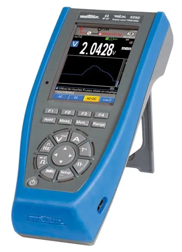 Multímetros con pantalla gráfica a colorSu funcionamiento es con pilas, baterías o conectados a la red eléctrica y, en el primer caso, son capaces de trabajar hasta 400 horas facilitando su utilización en campo. Además, para optimizar el consumo se puede activar el modo de espera y, con el acelerómetro interno, se puede reactivar el instrumento al pulsar cualquier tecla.
