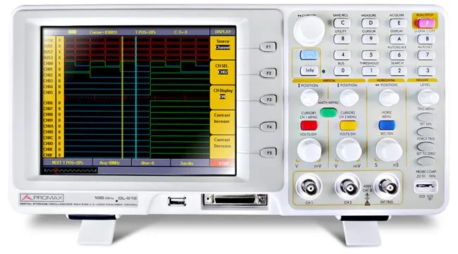 Como un buen ejemplo de la alta gama de osciloscopios profesionales y económicos se encuentra el modelo OL-612, un osciloscopio multifunción avanzado y un analizador lógico de 16 canales.
