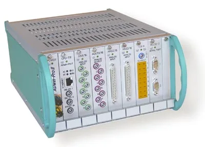 El Pro II ADwin está disponible en una amplia variedad de chasis resistentes entre los que se incluyen un sistema de escritorio para el laboratorio, un sistema portátil para viajes o un sistema de montaje en panel. Sus 5-16 ranuras y