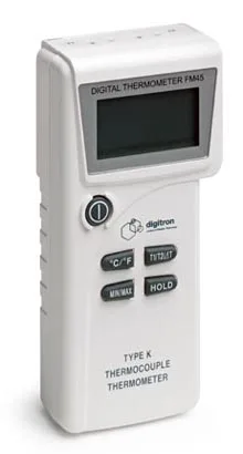 El Digitron FM45 con diseño impermeable se apaga automáticamente tras 20 minutos de inactividad y es posible calibrarlo mediante su teclado. Opera con una pila alcalina de 9 V que aporta una autonomía de unas 200 horas.
